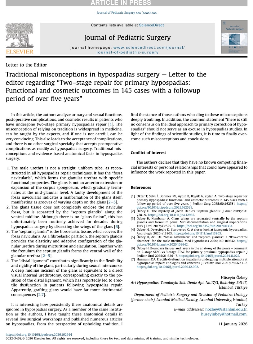 * Aşağıdaki bağlantıdan "Journal of Pediatric Urology" dergisinde yayınlanan hipospadias cerrahisi tekniğime ait yazıyı okuyabilirsiniz.